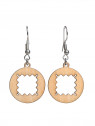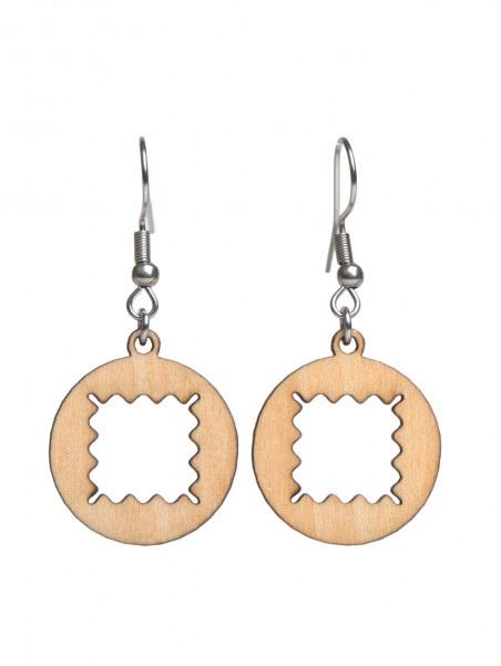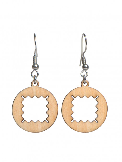 Une paire de boucles d'oreilles en bois à la forme assez abstraite.