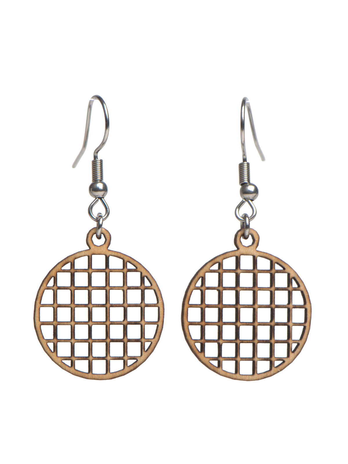Une paire de boucles d'oreilles en bois au quadrillage fin et délicat.